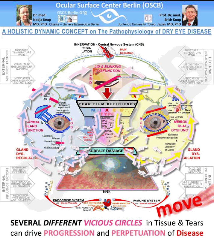 There are many other factors not discussed (or too small to see), such as Rosacea, Sjogren’s syndrome, Rheumatoid Arthritis, Lupus, Contact Lens use, Allergy, poor diet, Computer/excess screen use, but this has the key factors involved and shows how it can be a very vicious cycle.