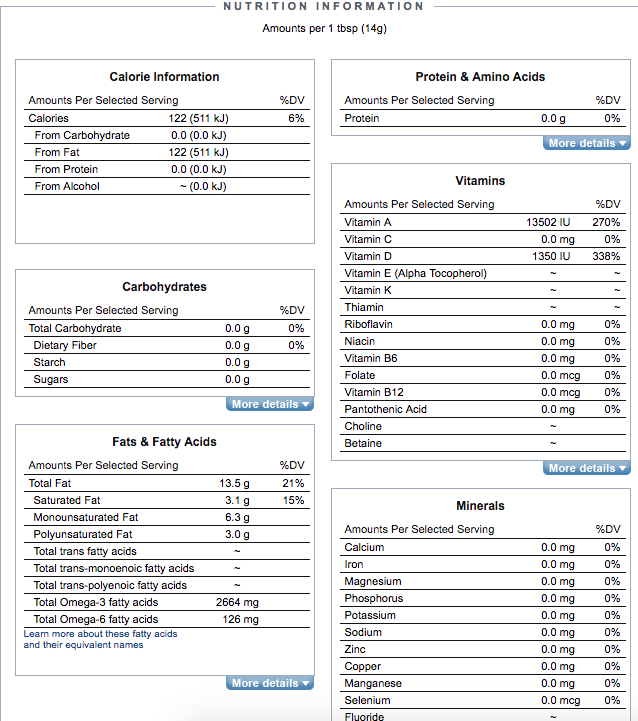 However, even the Weston Price Foundation acknowledges that there are dangerous versions of cod liver oil out there, even from some highly reputable companies like Nordic Naturals, which produces a cod liver oil that is clearly excessive in vitamin A as it only has 3 to 60 units of vitamin D per tablespoon but between 150 and 12,000 times as much vitamin A. It’s a delicate balance.
