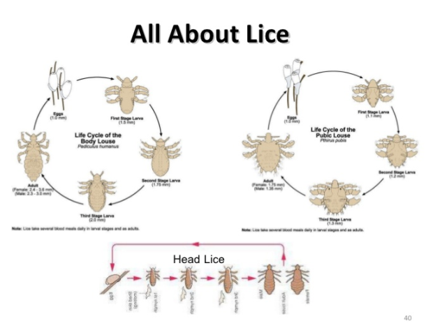 3. Transmission of lice is from human head to muman head contact thru hands, brushes, combs, etc. head-to-head contact.