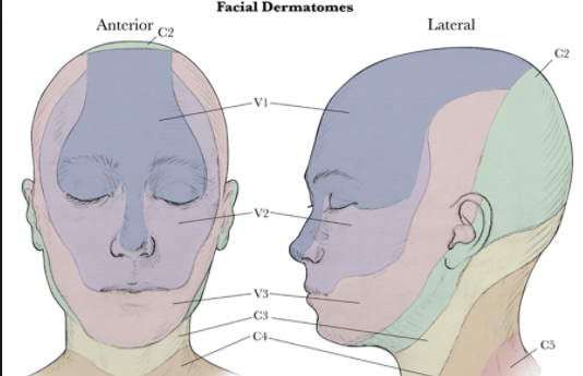 This is a young girl who came in with this skin lesion. Her pediatrician was worried about Herpes Zoster. However, the lesion goes beyond the V1 (Trigeminal Cranial Nerve 5’s 1st branch) territory to touch the V2 territory, which makes this Herpes Simplex and not Herpes Zoster (also known as Shingles).