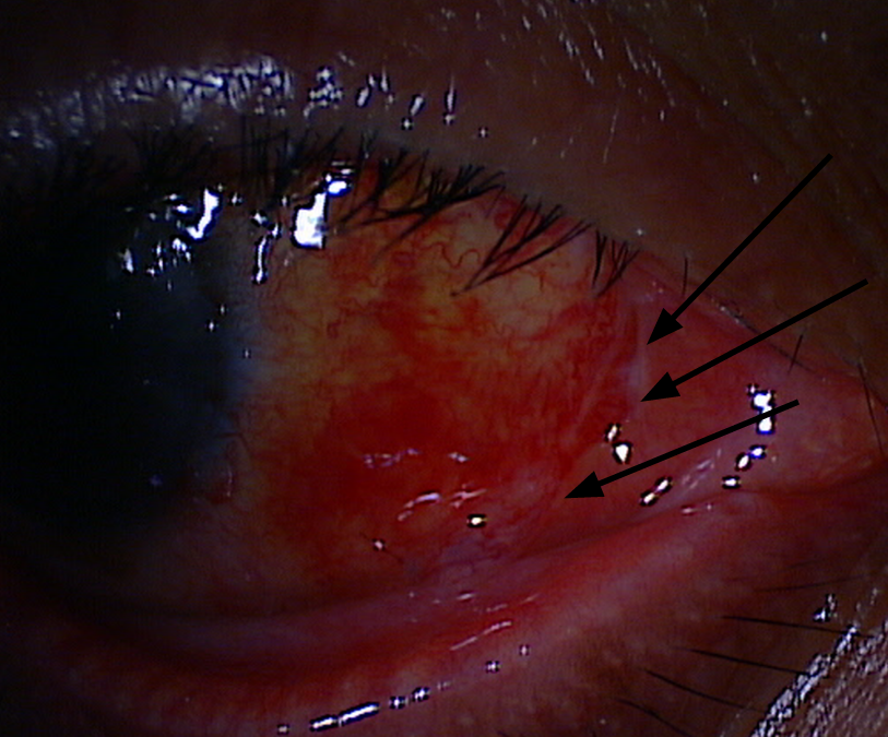 We are looking at the best way to avoid the scarring you can see near the nose in the patient who had surgery below in Texas by a high volume pterygium surgeon. There is no recurrence at 1month, but a curvilinear scar (pointed out by the black arrows) is developing and will lead to a noticeable scar that does not look “natural.”