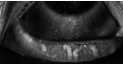 Meibography of severe meibomian gland loss (those white columns that look like they are falling or crumbling..are what are left of meibomian gland structures and it’s oil).