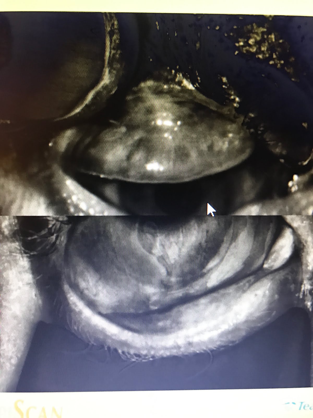 This is his Right Eye (below on left) with upper lids fipped to see Meibomian glands. This is his Left Eye (on the right side of screen). He has very few glands left.