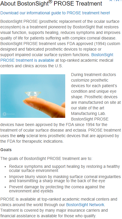 The PROSE was the first well-tolerated FDA approved Scleral Contact Lens. I used this when at Harvard and it worked well for patients with severe dry eye from Stevens John’s, GVHD, chemical burns. We had not starting using PROSE for “just dry eye” when I was at Harvard but in the last 5-10 years PROSE has been used more and more for Dry Eye.